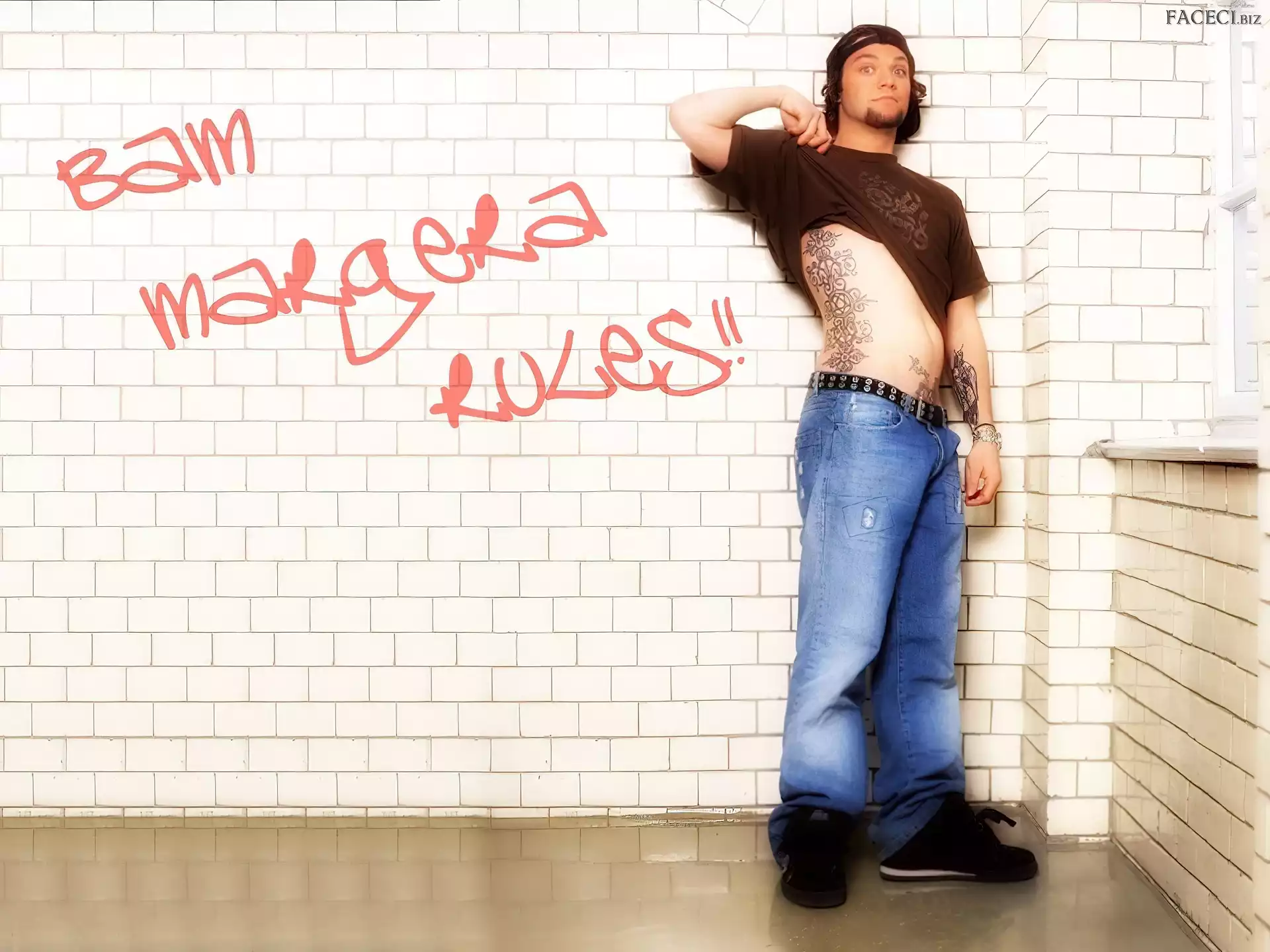 t-shirt, Bam Margera, brązowy kurtka, Bam Margera, rozpięta okulary, Bam Margera, butelka okulary, Bam Margera, twarze włosy, Bam Margera, ciemne zegarek, Bam Margera, deskorolka